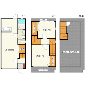 | 間取り内訳 | 1F:LDK15.8帖 2F:洋室7.3帖・5.7帖 屋上:ルーフバルコニー | ||